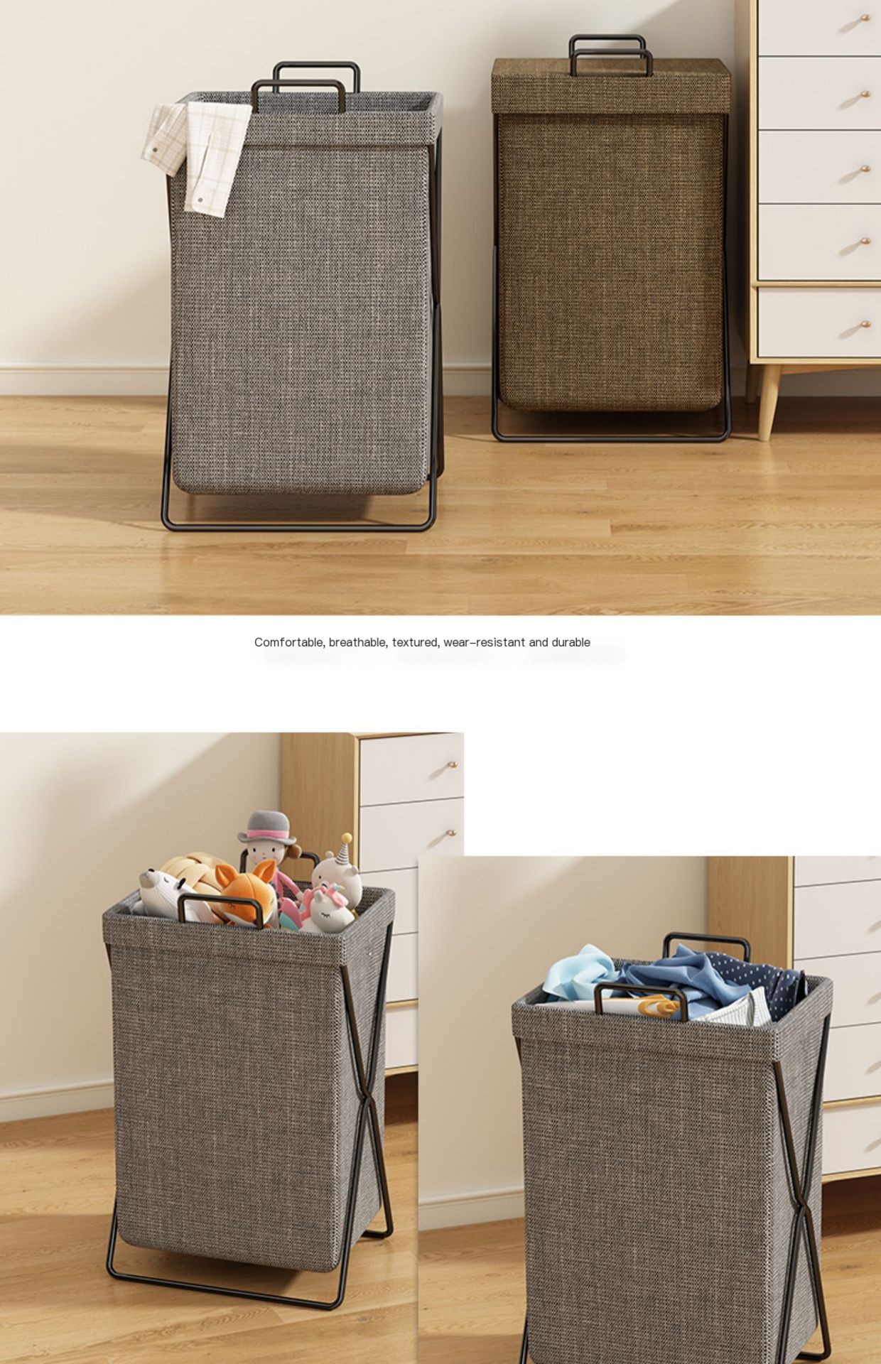 Fabricado en tela de alta calidad, es ideal para el baño, lavandería o dormitorio. Su diseño minimalista combina con cualquier decoración y permite almacenar ropa, toallas o textiles de forma práctica y estética.