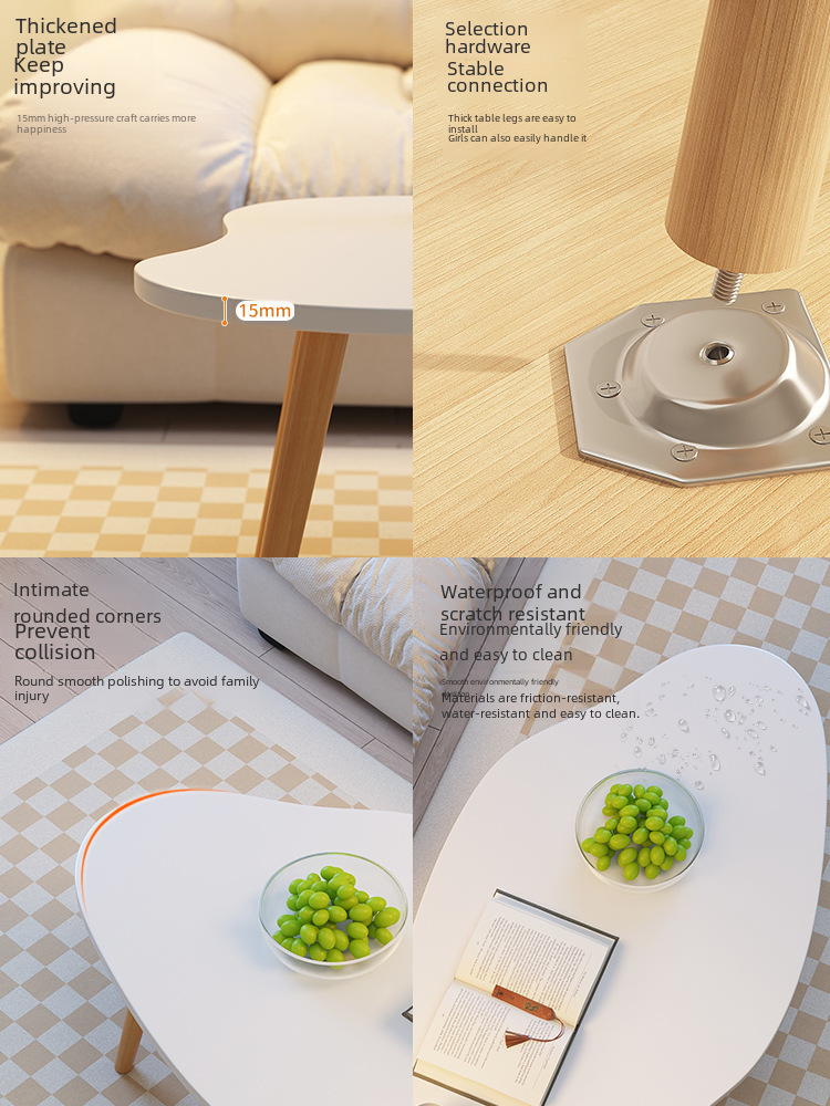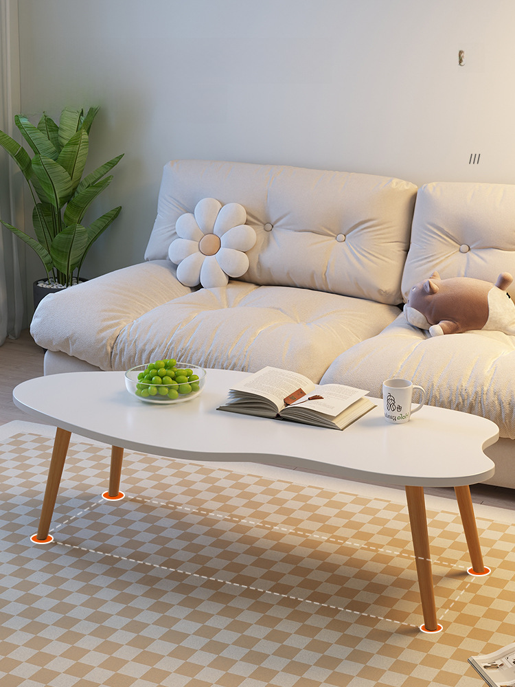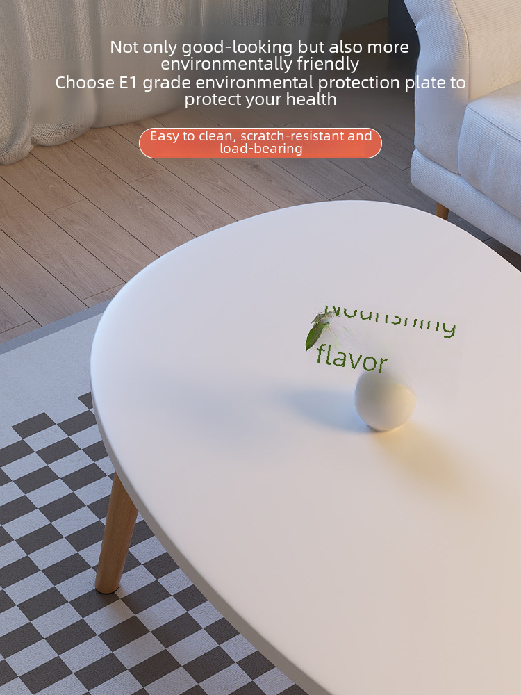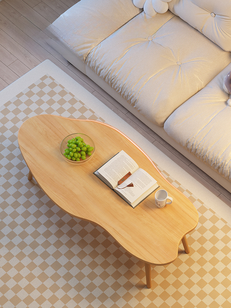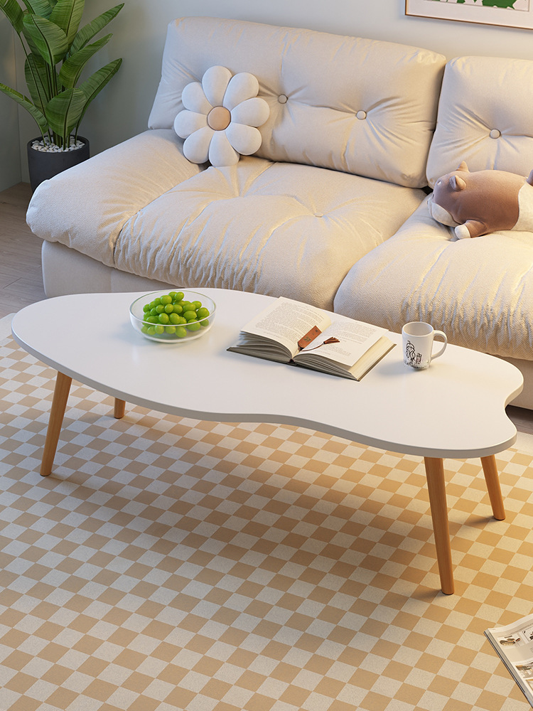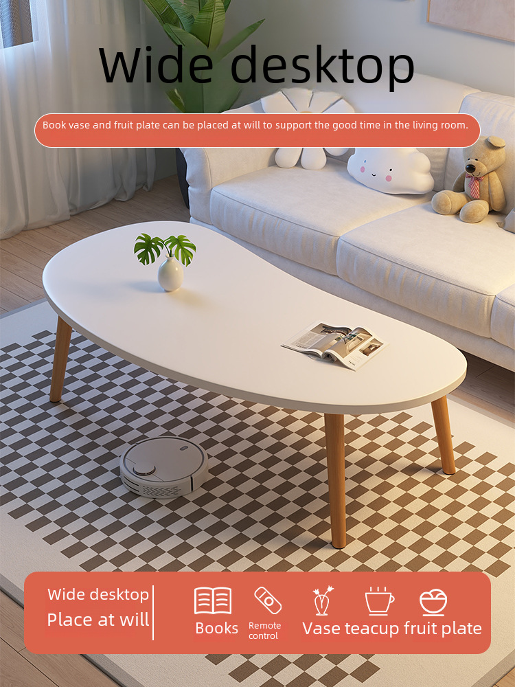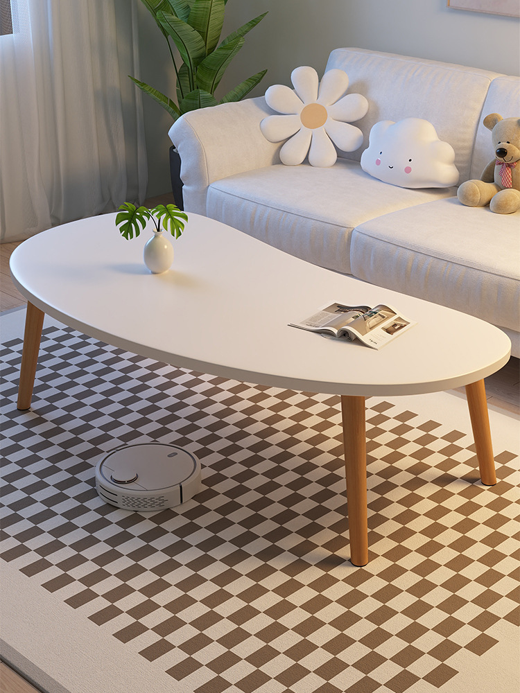 Mesa de centro moderna y minimalista ideal para departamentos pequeños, salas de estar o dormitorios. Su diseño sencillo y elegante combina una superficie blanca de forma orgánica con patas de madera natural, aportando un estilo nórdico y acogedor.
