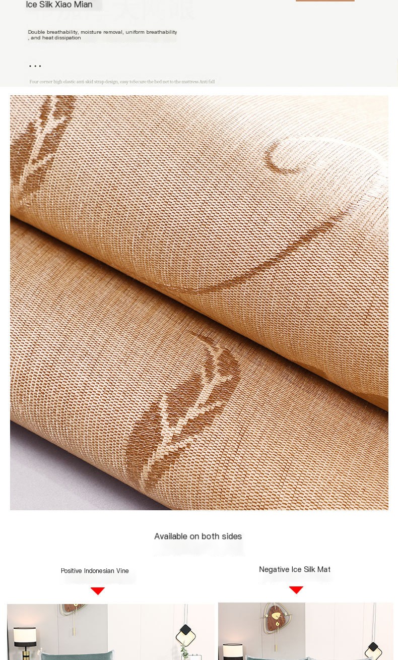 El IceSilk Luxe Mat combina la textura natural del ratán con la suavidad y frescura de la seda fría (ice silk), ofreciendo una experiencia de descanso ligera y elegante. Su diseño moderno, con bordes satinados y acabado fino, lo convierte en el complemento ideal para el dormitorio durante los meses cálidos.